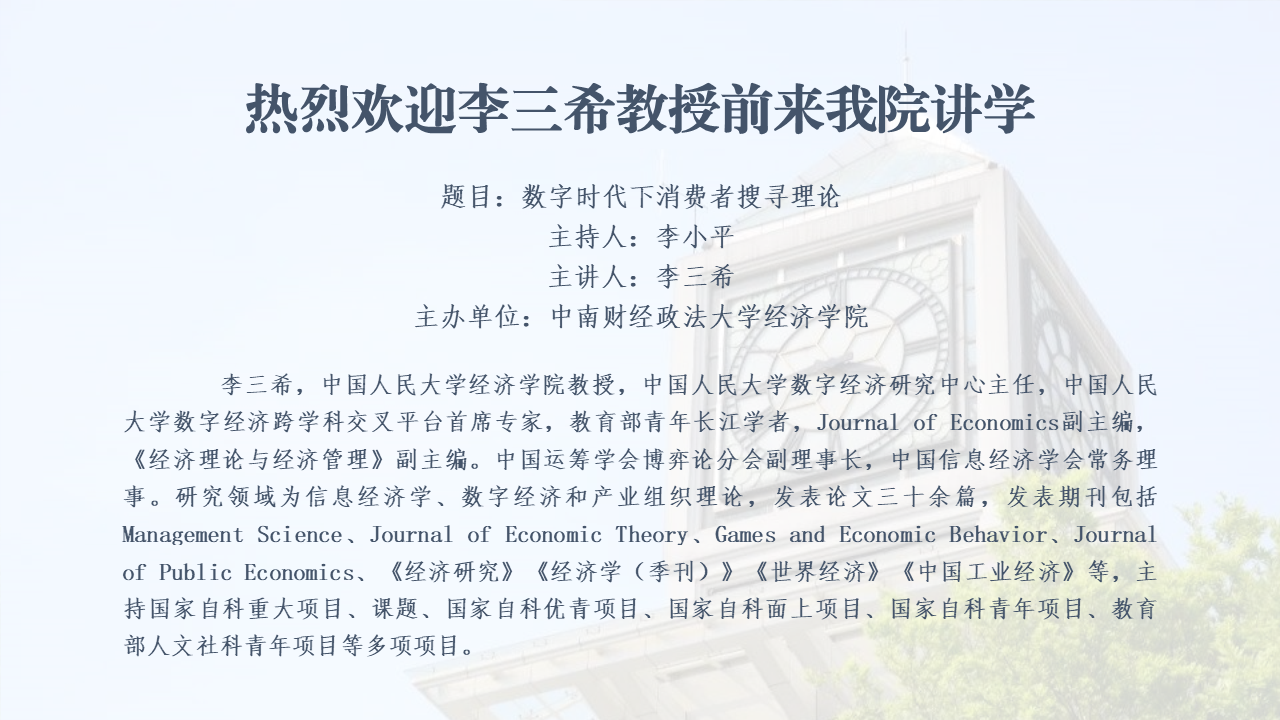 2022年4月15日晚19:00,由3118云顶集团举办的文澜高端论坛系列活动在云端顺利举行。本次活动我们有幸邀请到中国人民大学3118云顶集团李三希教授作题为“数字时代下消费者搜寻理论”的学术讲座。讲座由3118云顶集团李小平教授主持。活动反响热烈,共有院内外三百余名师生积极参与。